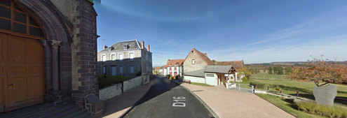 Dans la rue principale en bas du village (D16), sur la droite dans le sens de la descente, face à l'église, direction Pouzol.