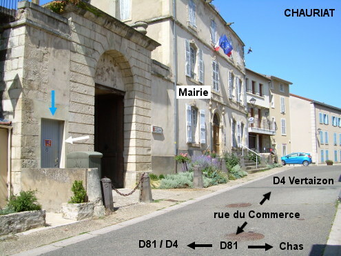 Les toilettes se trouvent dans un grand bâtiment situé à gauche de la Mairie sise au bord de la rue qui traverse le centre-ville du nord au sud, et à proximité de l'église. N.B. : Le lavabo est trop petit pour remplir un bidon directement. 1) En provenance de Saint-Bonnet-lès-Allier sur la D81 qui rejoint la D4 et se superpose à elle sur la gauche, au carrefour en Y ignorer la rue à droite en sens unique, peu après tourner à droite dans la suite de la D81 direction Chas puis 100 mètres plus loin tourner dans la troisième à gauche (rue du Commerce, étroite). Lorsque l'on aperçoit côté droit une halle puis l'église, s'arrêter aussitôt à gauche : la porte des toilettes (bien identifiée) est là, avant le porche qui est à gauche de la Mairie. 2) En provenance de Chas sur la D81, au carrefour où une flèche ''D81 Chas'' pointe la direction d'où l'on vient, et où une autre flèche pointe à gauche en direction de Pérignat-sur-Allier, prendre la rue en face (rue du 11 novembre). On débouchera plus loin, entre l'église à droite et la halle à gauche, à un carrefour en T sur la rue du Commerce devant la Mairie. Tourner à gauche pour trouver la porte des toilettes à droite après le porche. 3) En provenance de Vertaizon sur la D4, au carrefour où l'on voit une ancienne borne directionnelle Michelin (gros cube sur un pied), prendre la rue étroite en face (rue du Commerce). On arrivera plus loin vers la Mairie sise côté droit (en sens inverse du point 1).