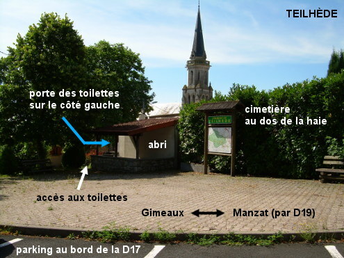 Les toilettes se trouvent au fond du parking situé à gauche de l'ancien cimetière implanté au bord de la D17 dans le bourg. 1) En provenance de Manzat sur la D19 puis la D17, juste après le cimetière implanté côté droit à l'entrée d'un virage à droite, entrer à droite sur le parking et se diriger vers le fond vers la droite pour trouver le petit bâtiment des toilettes à gauche d'un abri, tous deux accolés au mur du cimetière. La porte des toilettes est sur le côté gauche, en haut des escaliers qui montent depuis la rue de l'église (à 35 mètres de l'entrée du parking). 2) En provenance de Gimeaux sur la D17, quand on verra côté droit une obélisque et une croix au début d'une rue adjacente, tourner à gauche dans la rue de l'église, qui est en face, et parcourir 30 mètres jusqu'aux escaliers (sept marches) sur la droite qui montent jusqu'à la porte des toilettes. N.B. : On pouvait continuer sur la D17 jusqu'à l'entrée du parking pour éviter les escaliers.
