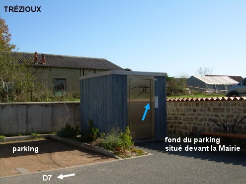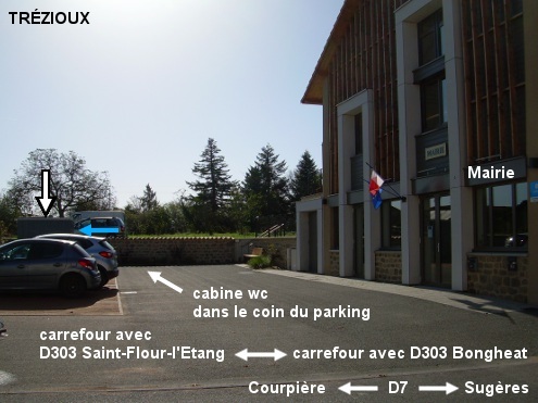 Les toilettes se trouvent au fond du parking situé devant la Mairie sise au bord de la D7, entre ses deux carrefours avec la D303. 1) En provenance de Sermentizon sur la D44 puis la D7, après le carrefour à gauche avec la D303 venant de Saint-Flour-l'Étang et où la D7 vire à droite, entrer à gauche sur le parking qui est juste devant la Mairie dont la façade nous fait face. La cabine WC couleur inox est au fond à gauche dudit parking. Il s'agit de toilettes auto-nettoyantes, mais avec un lavabo doté d'un classique robinet-poussoir. N.B. : Elle est concernée par une fermeture nocturne de 22h à 6h. 2) En provenance de Sugères sur la D7, 60 mètres après le carrefour à gauche avec la D303 venant de Bongheat, entrer à droite sur le parking (de la Mairie que l'on n'identifie pas dans ce sens) en suivant la petite flèche ''WC'' pointant vers la droite pour indiquer leur présence au fond dudit parking.