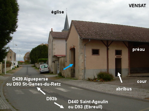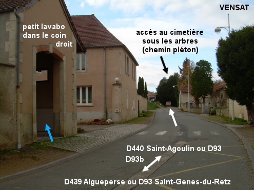 Les toilettes se trouvent au bord de la D93b dans sa portion entre le cimetière et l'église. 1) En provenance de Saint-Agoulin sur la D22 puis la D440, au carrefour en T à côté du cimetière implanté à droite, tourner à droite dans la D93b (direction Aigueperse, par la D439). Quelques mètres plus loin après une rue adjacente à droite, juste après une cour située à droite entre deux bâtiments et un passage piéton, entrer côté rue dans les toilettes qui sont dans le bâtiment qui borde la cour et comporte un abribus et un préau que l'on voyait face à soi en arrivant sur la route. N.B. : Le lavabo étant trop petit, on peut se rabattre sur le robinet du cimetière. 2) En provenance d'Aigueperse sur la D439, au carrefour en T face à la Mairie et à côté de l'église érigée à gauche, tourner à gauche direction Ebreuil (par la D93 puis la D207) pour trouver les toilettes quelques mètres plus loin côté gauche dans un grand bâtiment juste avant le passage piéton.
