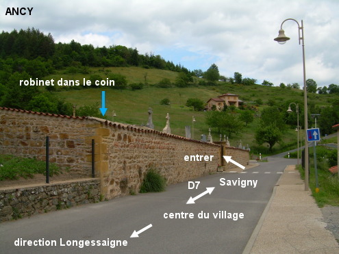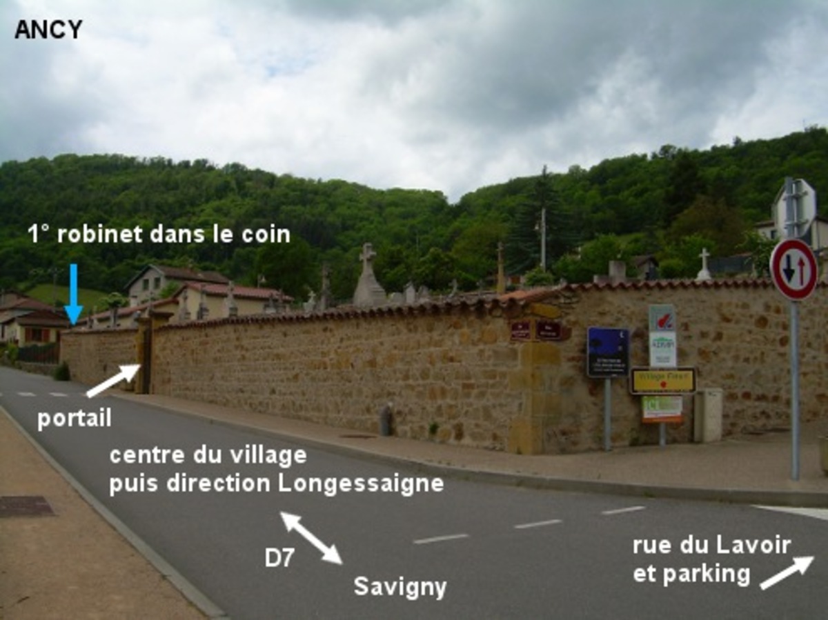 Le cimetière est implanté côté droit derrière une rue adjacente à l'entrée du village sur la D7 en provenance de Savigny. Entrer par le portail qui donne sur la D7 (actionner la poignée puis pousser fort sur le battant qui est lourd à manœuvrer) et monter les sept marches d'escaliers puis se diriger vers le coin gauche pour trouver le premier robinet du cimetière (à 20 mètres du portail). N.B. : Il n'y a aucun écriteau à côté de ce robinet, par contre le deuxième robinet, situé à l'extérieur à droite du portail sis rue du Lavoir (dans le coin opposé), est accompagné quant à lui d'un écriteau ''eau non-potable''. On peut donc considérer que s'il n'y a rien à côté du premier robinet, c'est que son eau n'est pas elle aussi impropre à la consommation. Ceux qui auraient néanmoins des doutes peuvent opter pour les toilettes du village, dans le centre entre la D7 et la Mairie (et l'église).