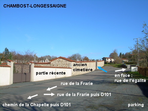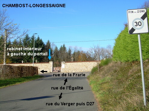 Le cimetière est situé dans une rue secondaire, non loin du stade. 1) En provenance de Saint-Clément-les-Places sur la D101, traverser le bourg puis au carrefour à droite avec la D27 continuer tout droit en direction de Panissières dans la D101. Tourner ensuite dans la première à gauche en suivant la flèche ''cimetière'' (N.B. : Si on arrive en sens inverse de Panissières on ne la voit pas mais il faut tourner en épingle à gauche tout de suite derrière le panneau de début de village). Passer à côté de la salle polyvalente puis de terrains de sport côté droit, puis au carrefour en T tourner à droite dans la suite de la rue de la Frairie. Le cimetière est implanté côté gauche un peu plus loin. Ignorer le premier portail car il n'y a pas de robinet à côté. Entrer donc par le deuxième portail (celui de droite, qui est en face de la rue de l'Égalité). Le robinet est à l'intérieur du cimetière tout de suite à gauche de ce portail (à 330 mètres de la D101). 2) En provenance de Villechenève sur la D27, juste après le panneau de début de village tourner à droite en suivant la flèche jaune ''déviation P.L.'' (rue du Verger). Monter puis sur le replat vers l'aire de jeux implantée à droite continuer tout droit dans la rue de l'Égalité jusqu'à arriver face au portail de droite du cimetière (à 490 mètres de la D27). P.S. : Il y a un plan du village au bord de la D101 vers une arche qui donne sur le parvis devant l'église, située entre le carrefour D27 / D101 et la Mairie.