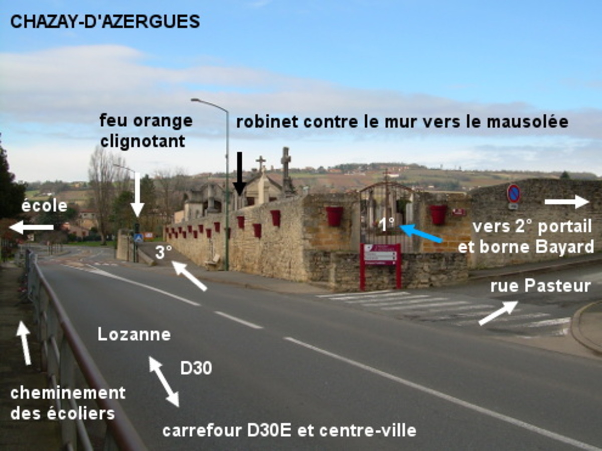 Le cimetière est implanté côté droit et presque en face d'une école au début de la D30 direction Lozanne. Il comporte trois portails et deux points d'eau. Le plus facilement accessible est la borne Bayard installée vers le coin à droite du portail sis rue Pasteur. 1) En provenance de Morancé sur la D30, rouler tout droit pendant un long moment. Au grand carrefour avec deux îlots triangulaires et où en face c'est le début de la D30E direction Civrieux d'Azergues, tourner à droite dans la suite de la D30 direction Lozanne. Environ 240 mètres après, et après les panneaux de danger annonçant une zone scolaire (et avant le feu orange clignotant), on verra le cimetière implanté côté droit derrière une rue adjacente (rue Pasteur). 1a) Si l'on entre par le premier portail, celui dans l'angle, il faudra avancer de 30 mètres (allée asphaltée) et se faufiler entre une tombe et le grand mausolée pour accéder au robinet fixé sur un support métallique en forme de borne contre le mur d'enceinte. N.B.1 : Ce robinet-poussoir fonctionnant avec des à-coups n'est pas très pratique à utiliser. 1b) Si l'on entre par le deuxième portail, celui sis rue Pasteur à 60 mètres de la D30, se diriger vers la droite (allée asphaltée de 25 mètres) pour trouver la borne Bayard à molette droite, peinte en gris clair. N.B.2 : Il suffit de tourner la molette d'un quart de tour vers l'arrière pour que l'eau coule presque aussitôt. 1c) Il n'y a pas de point d'eau à proximité du troisième portail qui est à côté de la D30 près du feux clignotant signalant la potentielle traversée d'écoliers. 2) Sur la D30 en provenance de Lozanne, au niveau de la zone scolaire, traverser sur le passage piéton signalé par le feu orange clignotant pour rejoindre le cimetière implanté côté gauche.
