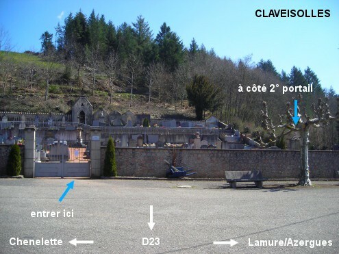 Le cimetière est situé côté gauche sur la D23 en direction de Lamure-sur-Azergues. Entrer par le premier portail côté route et esplanade avec abribus, à l'intérieur se diriger en diagonale vers la droite en direction du deuxième portail (sur le mur droit du cimetière et qui semble verrouillé), le robinet est à l'intérieur à la droite de ce deuxième portail (quand on le regarde depuis l'intérieur).