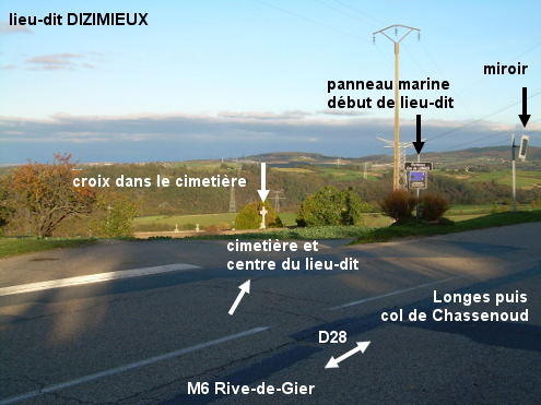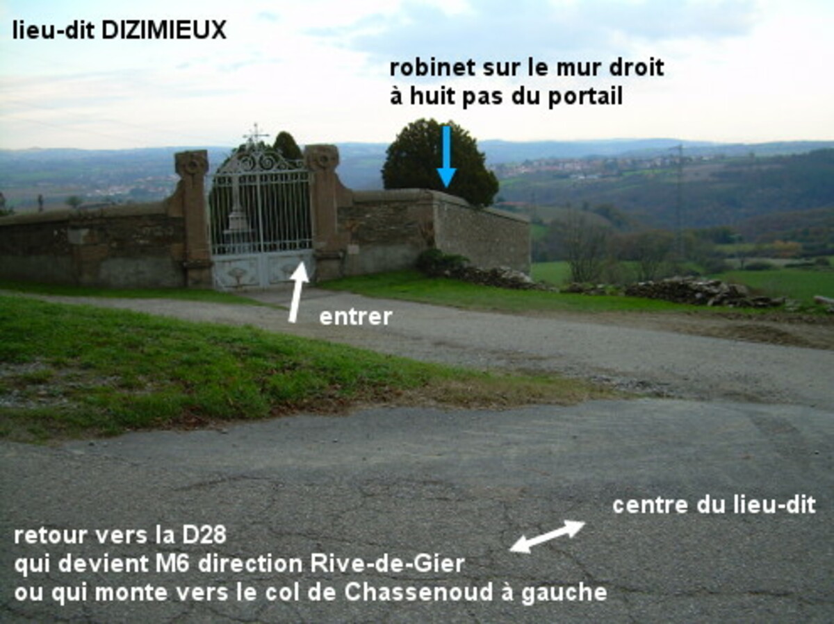 Le cimetière de ce lieu-dit rattaché à la commune de Longes est situé à l'entrée, à 70 mètres de la D28 quand on vient de Rive-de-Gier. 1) En provenance de Génilac sur la M6, dans la traversée de Rive-de-Gier au pseudo rond-point sur le carrefour M6 / M88, tourner à gauche (M88 superposée à la M6) en direction de Châteauneuf (la flèche est très décalée à gauche) puis deux ronds-points plus loin tourner à droite en direction de Châteauneuf et Longes (M30 superposée à la M6), au rond-point suivant prendre la première sortie en direction de Longes et enfin au rond-point d'après (la M6 se sépare de la M30 qui continue en direction de Sainte-Croix-en-Jarez) prendre sur la troisième sortie la M6 direction Longes. Ensuite au changement de département la M6 devient D28. Surveiller le côté gauche de cette route qui monte (en direction du col de Chassenoud) pour repérer le petit panneau marine de début du lieu-dit dans la fourche du carrefour à gauche avec la rue qui dessert le cœur du lieu-dit. Prendre la branche gauche de ce carrefour en Y (on aperçoit déjà le cimetière) puis tourner à gauche dans l'allée asphaltée qui mène au portail du cimetière. Entrer et faire huit pas sur la droite en diagonale pour trouver le robinet sur le mur droit. 2) En provenance de Longes sur la D28, longtemps après le panneau de début du lieu-dit, après le carrefour à gauche avec la D625E qui vient de la D625 en provenance du col de Grenouze, après une partie avec des habitations près de la route, peu après un abribus au bord de la route tourner en épingle à droite pour accéder au cimetière comme en fin du point 1.