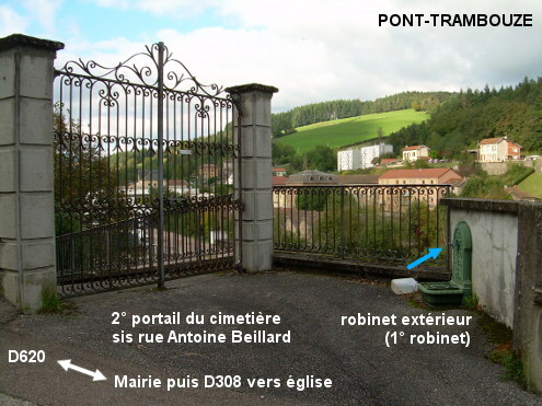 Le cimetière est implanté sur les hauteurs du village et il est visible depuis la D620 (suivre la direction de Lagresle). Il comporte trois portails et trois robinets, dont le plus accessible se trouve à l'extérieur en face du portail du milieu. 1) En provenance de Mardore sur la D56, environ 1,65 km après la fin de ce village, au sortir d'un virage à droite à un carrefour où il y a à droite une croix dans la patte d'oie, et à gauche un premier chemin puis un deuxième, tourner dans ce dernier qui est le ''chemin du Crozet'' et descendre (pente prononcée). Beaucoup plus bas, au carrefour en T (une flèche indique le lieu-dit Les Rousses dans la direction d'où l'on vient) en surplomb du village tourner à droite et peu après ignorer les deux rues à droite (dont l'une avec un panneau sans issue). On arrive ensuite (de la rue de la Gare) à l'intersection avec la D308 (à grande circulation) : prendre en face la direction de Lagresle dans la D620 (rue Jean Poyet) et remonter. Puis ignorer le premier portail du cimetière que l'on voit sur la gauche en contrebas au bout d'une courte allée oblique, pour continuer jusqu'au replat puis prendre la branche gauche du Y (rue Antoine Beillard) et redescendre un peu (20 mètres) vers le deuxième portail qui est orienté face au sens opposé de circulation. Le premier robinet est à l'extérieur au-dessus d'une sorte de vasque vert foncé, dans le recoin qui est devant ce portail et face au portail. Si on continue à descendre, on arrivera vers le troisième portail qui est également orienté face au sens inverse de circulation, mais devant un grand espace. 2) En provenance de Lagresle sur la D82, au lieu-dit La Croix-Mulsant peu avant un ensemble de bâtiments groupés, tourner à gauche dans le ''chemin de la Prat''. Continuer tout droit, traverser le lieu-dit Moncorgé, une borne nous indique que nous sommes sur la D620. Plus loin, 590 mètres après le panneau de début de village (et après le lieu-dit Vif-Cœur) juste avant le panneau marine avec le nom ''rue Jean Poyet'', prendre la branche droite du carrefour en Y (chemin des Cités Beausoleil) pour arriver 90 mètres après sur la rue Antoine Beillard près du troisième portail (sur la droite). En remontant un peu côté gauche (moins de 50 mètres) on arrivera face au deuxième portail avec le robinet à l'extérieur en face de celui-ci dans le recoin à droite de la rue. 3) En provenance de Bourg-de-Thizy sur la D308 (à grande circulation, avec bandes cyclables, environ 2,8 km), juste avant l'église érigée côté gauche, tourner à gauche (rue Jean Poyet) en direction de la Mairie (suivre la flèche). La Mairie (et agence postale) est implantée côté gauche un peu plus loin après un parking, et la rue vire à gauche. À 130 mètres de la D308 on arrivera devant le troisième portail (dans l'ordre de citation dans ce texte) du cimetière. Pour trouver son deuxième robinet : entrer, il est alors tout de suite à gauche au-dessus d'une espèce de vasque. P.S. : Il y a un troisième robinet, si besoin, parcourir les 40 mètres d'allée asphaltée coincée entre le mur droit et un muret à gauche délimitant la partie avec les sépultures. Ce robinet est alors sur la droite au-dessus d'une sorte de vasque.