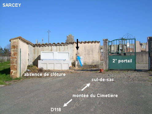 Le cimetière est visible depuis la D118 quand on arrive de Saint-Germain-sur-l'Arbresle. Il est implanté dans une courte rue en impasse et composé de deux parties. Le robinet se trouve dans la partie la plus ancienne au bout du cul-de-sac. 1) En provenance de Saint-Germain-sur-l'Arbresle sur la D19 puis la D118, dans la descente vers le village on aperçoit le cimetière côté gauche derrière les vignes dans le virage à gauche. Tourner dans la première à gauche et monter vers le cimetière jusque devant le deuxième portail au fond (à 90 mètres de la D118). Entrer et faire trois pas en avant pour trouver le robinet à gauche du portail (fin mars 2026 la haie servant de clôture à gauche du portail n'existait plus, au moins depuis un an). 2) En venant de Saint-Romain-de-Popey sur la D67, celle-ci rejoint la D118 sur un carrefour en T, continuer sur la droite, puis tandis que la D67 se poursuit sur la branche gauche d'un carrefour en Y en direction du lieu-dit Les Ponts-Tarrets, prendre la D118 sur la branche droite. Peu après tourner à droite en suivant la petite flèche ''cimetière'' et monter jusqu'au deuxième portail du cimetière pour trouver le robinet à proximité.