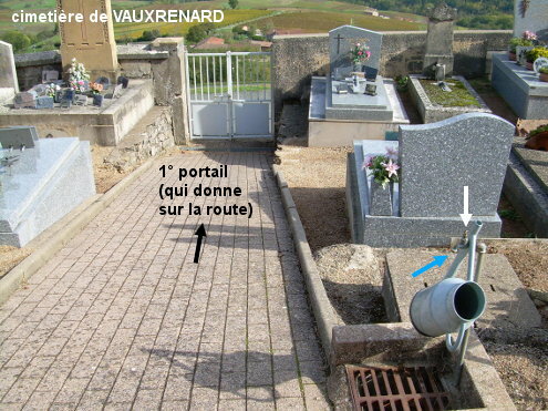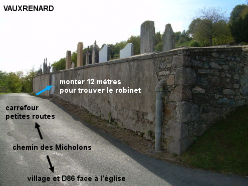 Le cimetière (fléché) est situé sur une route secondaire sur les hauteurs du village. 1) À partir de la D86 au centre du village, prendre en face de l'église le chemin des Micholons qui monte (c'est assez pentu au début, ensuite c'est plat) en suivant la flèche indiquant la direction du cimetière. Suivre cette route (ignorer les embranchements à droite), ignorer la bretelle à droite qui monte vers le portail latéral du cimetière, continuer tout droit jusqu'au portail donnant directement sur la route (à 570 mètres de la D86). Entrer et avancer d'une douzaine de mètres sur l'allée en pavés autobloquants qui monte, pour trouver le robinet fixé sur une tige à gauche de ladite allée. 2) En provenance d'Émeringes sur la D164, au carrefour avec la D86 au bord du village (qui est sur la droite), tourner à gauche (pas totalement à gauche dans la D86E) dans la D86 en direction de Chiroubles. On aperçoit ensuite le cimetière à droite sur les hauteurs, et peu après le point kilométrique 11, tourner en épingle à droite (en direction du cimetière, mais la flèche est orientée pour ceux qui viennent du col de Durbize), ce carrefour est annoncé avec un panneau de priorité à droite. Au carrefour en X peu après, tourner à droite en direction du cimetière (chemin des Micholons). Le cimetière est ainsi implanté côté gauche, et son premier portail est à 290 mètres de la D86. P.S. : En repartant, on peut soit continuer tout droit pour rejoindre la D86 vers l'église, soit revenir au carrefour en X et prendre à droite la ''route de Montgoury'' qui monte au col du Fût-d'Avenas (variante plus tranquille que la D18).