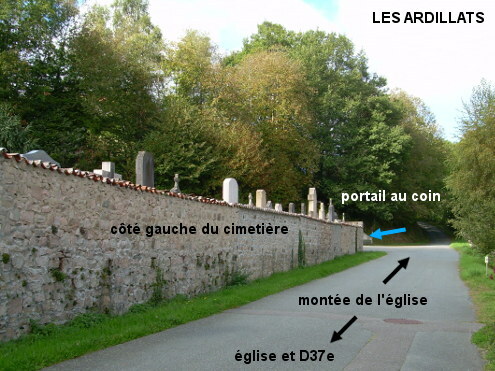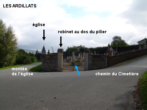 Le cimetière se trouve dans une rue secondaire à 240 mètres de l'église érigée au bord de la D37e qui traverse le village. En provenance du col de Crie sur la D43 puis la D37e (attention : au carrefour D43 / D37e tourner à droite en épingle), tourner à droite juste avant l'église et monter jusqu'au cimetière implanté côté gauche. Le portail se trouve dans la pointe du carrefour en Y renversé avec la rue adjacente à gauche. Le robinet est à l'intérieur du cimetière, sur le pilier de gauche du portail. P.S. : En reprenant la D37e et en continuant tout droit on arrivera en T sur la D337 à grande circulation mais on n'aura que 1,4 km hors zone urbaine jusqu'au lieu-dit Les Dépôts où on trouvera la D129 direction St-Didier-sur-Beaujeu.