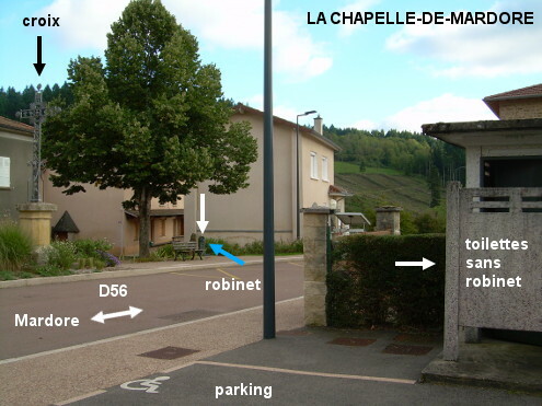 Le robinet se trouve quelques mètres à droite de l'église, au bord de la D56 qui traverse le village. 1) En provenance du col de Burdel sur la D94 puis la D56 (en direction de Mardore), peu avant l'église érigée côté droit on verra le robinet sur un support espèce de vasque vert foncé, installé dans le triangle entre la D56 et une rue adjacente en épingle à droite (chemin chez Cadet), sur lequel il y a une grande croix, avant le parvis qui est à droite de l'église. 2) En provenance de Saint-Vincent-de-Reins sur la D9 puis la D56E, au carrefour avec la D56 tourner à gauche dans la D56 puis peu après l'église érigée côté gauche, et juste après la croix dans le carrefour en Y avec une rue adjacente, on verra le robinet sur son support à gauche de la D56. N.B. : La fermeture hivernale se prolonge relativement tard. P.S. : Quelques mètres plus loin, au début du parking côté gauche (en face de l'église), il y a des vieilles toilettes de type vespasienne, sans robinet.