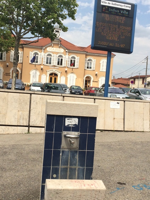 Le robinet se trouve le long de la route, devant la place de la mairie.