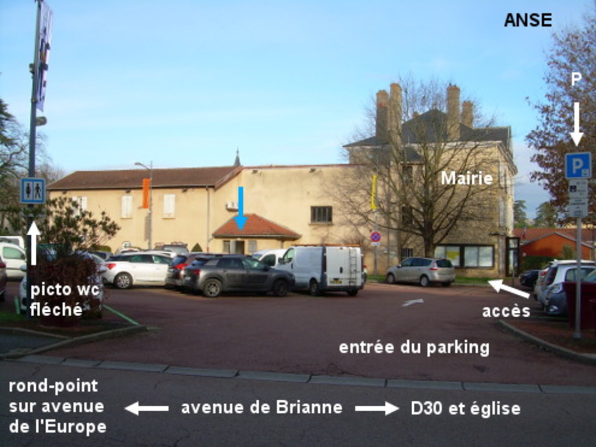 Les toilettes sont accolées à gauche de la Mairie qui est située au fond d'une place piétonne sise au bord de la D306 presque en face de l'église, et à côté d'un grand parking implanté dans l'angle avec une rue adjacente. 1) En provenance de Pommiers sur la D70E, au rond-point tourner à droite pour entrer dans la ville (panneau de début). Rouler tout droit dans cette avenue de l'Europe (parallèle à la D306 à très grande circulation) pendant un long moment (entre le premier rond-point situé à côté de la Gendarmerie et le deuxième rond-point, il y a une piste cyclable). Au deuxième rond-point, prendre la troisième sortie en direction de la Mairie (avenue de Brianne). Quand on aperçoit l'église au loin, entrer à gauche sur le parking, il y a un picto WC fléché sur le poteau à gauche de l'entrée du parking . Avancer jusque vers le bâtiment de la Mairie dont on voit le pignon. À la fin du parking, prendre l'allée piétonne à gauche qui dessert le petit bâtiment des toilettes accolé au bâtiment situé à côté et à l'arrière de la Mairie. N.B. : Dans ces toilettes accessibles aux handicapés, pour faire couler l'eau dans le lavabo inox dont l'extérieur est carré, appuyer fort sur la façade avant, ce qui appuie sur le mécanisme de commande. 2) En provenance de Saint-Bernard sur la D6 qui devient D39 en changeant de département (au premier rond-point continuer tout droit pour entrer dans la ville et passer sous le pont de la voie ferrée), au deuxième rond-point (première sortie) aussitôt suivi d'un troisième rond-point (deuxième sortie) suivre la direction du centre-ville et arriver ainsi sur la D306. Au carrefour en Y où la D306 part à gauche, rouler tout droit dans la D30 direction Lucenay. Peu après et avant l'église érigée côté gauche, on découvrira la Mairie côté droit en retrait derrière un parvis piéton. Quitter la route pour prendre l'allée piétonne qui débute derrière l'abribus et qui se dirige vers le pignon gauche de la Mairie. On trouvera alors les toilettes 60 mètres plus loin. 3a) En provenance de Lucenay sur la D30, aux feux tourner à gauche en direction de la Gendarmerie puis au rond-point prendre la première sortie en direction de la Mairie (avenue de Brianne) et idem fin du point 1. 3b) On peut aussi continuer tout droit sur la D30 et quand on arrive vers l'église érigée côté droit, tourner à gauche puis juste après prendre la deuxième entrée du parking à droite et avancer jusqu'à la fin du parking pour accéder à l'allée piétonne qui mène à gauche vers les toilettes.