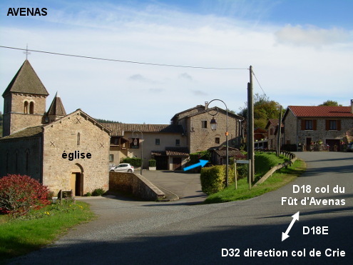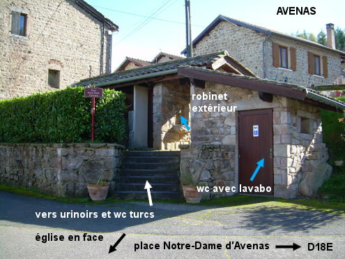 Le bâtiment des toilettes se trouve sur la place qui est à côté de l'église et en contrebas de la D18E. 1) En provenance du col de Crie sur la D32 puis la D18E, lorsque l'on voit l'église sur la gauche, entrer à gauche (carrefour en Y) sur la place située entre l'église et la D18E. Le bâtiment en pierre des toilettes est sur la droite au fond. Il y a d'abord une cabine WC de plain-pied accessible aux handicapés, et dotée d'un lavabo. Ensuite sept marches d'escaliers montent vers les autres parties des toilettes : à gauche et entourés de haies arbustives formant paravent deux urinoirs entre deux cabines WC turcs, en face des escaliers sous la partie ouverte mais abritée il y a un robinet extérieur au-dessus d'un évier en pierre. 2) En descendant du col du Fût-d'Avenas sur la D18, au carrefour à droite avec la suite de la D18 qui part en direction d'Ouroux, continuer tout droit, dans la D18E. Peu après, tourner en épingle à droite sur la place qui est à côté de l'église, pour trouver le bâtiment des toilettes au fond à droite.