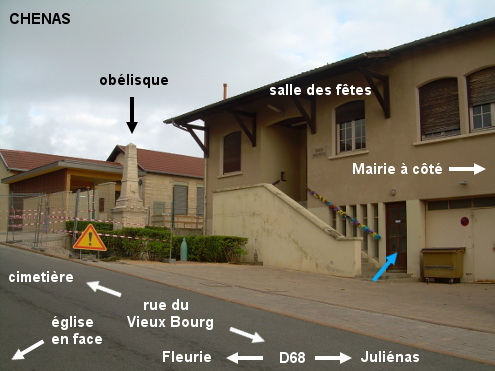 Les toilettes se trouvent dans le même bâtiment que la salle des fêtes située à gauche de la Mairie et en face de l'église sises au bord de la D68. Sur la D68 en provenance de Fleurie, tourner à gauche juste après l'église et avant la Mairie qui sont dans les angles du carrefour, pour trouver 40 mètres plus loin côté droit la porte des toilettes à côté des escaliers qui montent vers une entrée de la salle des fêtes et qui sont à proximité de l'obélisque.