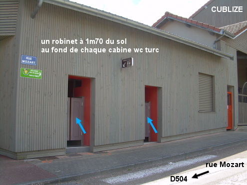 Les toilettes se trouvent dans un grand bâtiment au début d'une rue adjacente à la D504 située à côté du Monument aux Morts. Dans chacune des deux parties il y a un robinet à l'intérieur de la cabine WC turc, situé sur le mur du fond, celui de la chasse d'eau, à environ 1m70 du sol et près de la cloison avec l'entrée des toilettes. N.B. : Ce n'est pas du tout facile de rentrer dans les toilettes avec son vélo à cause des demi-portes à double battant sur des ressorts très très raides. En provenance de Grandris sur la D504, quand on verra côté droit l'obélisque du Monument aux Morts (avant le centre du village), tourner à droite juste après, pour trouver aussitôt les entrées des toilettes (la partie hommes avec les urinoirs est celle de gauche) sur le côté gauche de la rue.