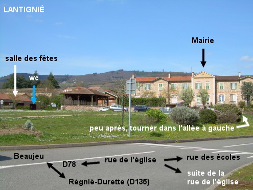 Ces toilettes se trouvent dans le même bâtiment que la salle des fêtes (elles sont toutes les deux fléchées) à 140 mètres de la D78. N.B.: Le lavabo est trop petit pour permettre le remplissage direct d'un bidon (pour cela, se rendre aux toilettes près de l'église). En provenance de Régnié-Durette sur la D135 puis la D78 (on aperçoit déjà l'imposant bâtiment de la Mairie et même celui de la salle des fêtes proche), tourner à droite en direction du centre du village et peu après tourner dans la première à gauche en suivant les flèches indiquant la salle des fêtes et les toilettes. Avancer jusqu'à la salle des fêtes et prendre la suite de l'allée à droite pour rejoindre l'extrémité droite du bâtiment dans laquelle une porte identifiée s'ouvre sur une cabine WC.