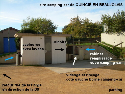 Ces toilettes se trouvent sur le parking accueillant l'aire pour camping-car (il y a donc aussi une borne pour camping-car avec robinets) situé à 20 mètres de la D9 à l'entrée du village en provenance de Régnié-Durette. N.B.1 : La cabine WC à nettoyage automatique est concernée par une fermeture nocturne de 22h à 6h (les urinoirs restent accessibles) et son lavabo est relativement petit. N.B.2 : Sur le bloc ciment borne pour camping-car situé à côté des toilettes, le robinet fileté surmonté d'un écriteau ''eau potable'' est celui sur le côté droit (l'autre robinet côté gauche sert pour le rinçage au-dessus de la trappe de vidange). 1) Sur la D9 en provenance de Régnié-Durette, environ 620 mètres après le panneau de début du village, à l'endroit où la route vire à gauche (on aperçoit l'église au loin) continuer tout droit en direction du cimetière : on aperçoit le panneau avec le pictogramme camping-car planté à droite de la rue à côté du petit bâtiment des toilettes.. Entrer aussitôt à droite sur le parking : la cabine WC est à gauche de l'accès au parking et la borne camping-car derrière la cabine WC dans le coin du parking. 2) En provenance de Marchampt sur la D9, après le centre-ville surveiller le côté gauche pour voir la petite flèche ''cimetière'' (en haut d'un ensemble de flèches locales) lorsque la route oblique à droite. Tourner alors à gauche puis entrer aussitôt à droite sur le parking à côté du pictogramme camping-car.