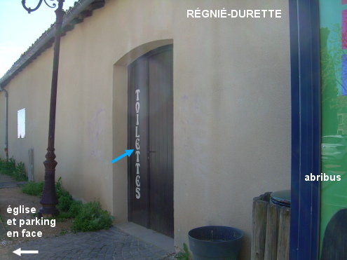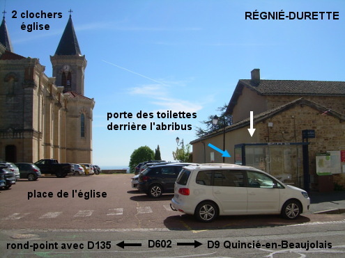 Les toilettes se trouvent dans un grand bâtiment sur le bord droit de la place sur laquelle est érigée l'église au centre du village. 1) Sur la D9 en provenance de Villié-Morgon, si l'on suit la flèche à droite de la D78 indiquant ''Régnié-Durette centre bourg'' et Lantignié, on arrivera plus loin au carrefour à gauche avec la D602. Tourner alors en direction du bourg puis au rond-point plat à l'intersection avec la D135 continuer tout droit pendant 350 mètres et entrer à gauche sur le parking sur la place autour de l'église. La porte des toilettes (identifiée par une inscription en très grosses lettres) est au début du bâtiment qui borde la droite de la place, juste derrière un abribus. 2) Sur la D9 en provenance de Quincié-en-Beaujolais, tourner à gauche en direction du centre du village (la flèche normalisée est orientée face à l'autre sens, mais on voit le grand panneau avec les informations locales). Environ 70 mètres après la Mairie sise côté droit, entrer à droite sur le parking autour de l'église, pour trouver les toilettes à droite juste derrière l'abribus qui est à l'angle.