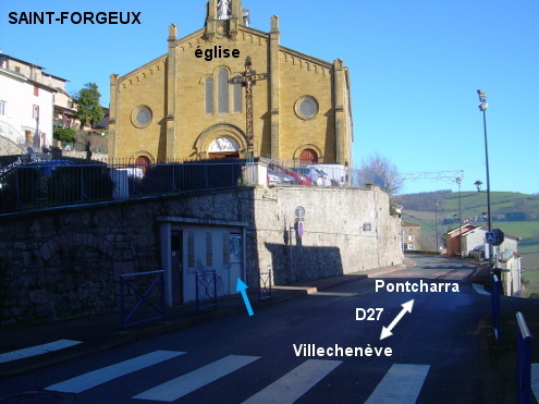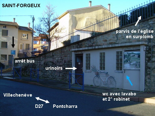 Ces toilettes se trouvent au bord de la D27 dans le mur de soutènement du parvis de l'église. N.B. : C'est dans la cabine WC (porte de droite) que l'on disposera d'un lavabo (relativement petit) et d'un deuxième robinet fixé au mur à droite du lavabo. En provenance de Villechenève sur la D27, peu après le centre-ville et la Mairie, juste derrière une rue adjacente à gauche, on verra l'église érigée côté gauche en surplomb. Traverser sur le passage piéton face à l'arrêt de bus pour trouver à sa droite dans le mur de soutènement les toilettes dont la devanture claire et décorée se remarque bien au milieu des pierres sombres du mur. La porte gauche donne dans un espace avec urinoirs (sans robinet) et celle de gauche dans une cabine WC avec un lavabo et un robinet supplémentaire.