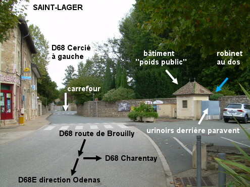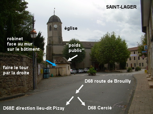 Ces toilettes se trouvent dans le bâtiment d'une ancienne bascule sur le parking situé à gauche de l'église sise au bord de la D68. 1) En provenance de Charentay sur la D68, au carrefour en T avec la D68E venant d'Odenas, tourner à droite dans la suite de la D68. Ignorer les premières toilettes sur le côté gauche qui n'ont pas de robinet et continuer jusqu'à l'église érigée côté droit. Juste après, entrer sur le parking et se diriger vers le petit bâtiment sur lequel est écrit ''poids public'' qui est sur la gauche du parking et presque contre le mur du fond. N.B. : Les robinet est fixé sur l'extérieur du bâtiment au dos de celui-ci donc face au mur, à côté des pissotières extérieures qui sont accolées à droite de ce cabanon (il y a peut-être un WC à l'intérieur mais la porte située côté mur était verrouillée). 2) En provenance de Cercié sur la D68, au carrefour en T avec la D68E venant à gauche du lieu-dit Pizay continuer à droite et peu après entrer à gauche sur le parking avant l'église. À son début se diriger vers le cabanon ''poids public'' et faire le tour de celui-ci par la droite pour se trouver entre celui-ci et le mur et accéder ainsi au robinet.