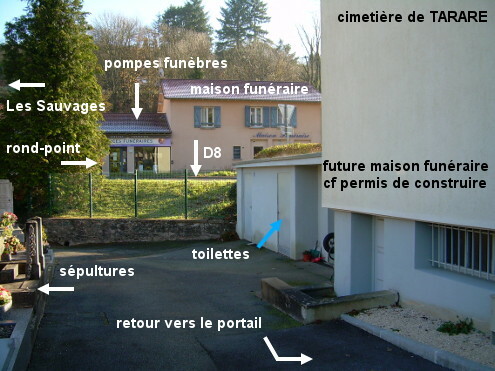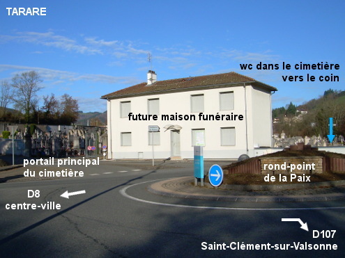 Ces toilettes se trouvent dans l'enceinte du cimetière dans le coin à droite du portail principal. Le cimetière est implanté au nord de la ville à côté du rond-point de la Paix situé au carrefour de la D8 et de la D107. 1a) En provenance de Saint-Clément-sur-Valsonne sur la D107 (éventuellement via le col de la Croix Paquet sur la D56E1, ou en provenance du col des Cassettes sur la D56 puis la D107 en suivant la direction de la Gendarmerie), au rond-point avec la D8 prendre la deuxième sortie qui est la rue qui dessert le portail principal du cimetière situé alors à droite (et que l'on voit depuis le rond-point). Entrer et se diriger vers le coin à droite (allée asphaltée). Dans le petit bâtiment au coin, c'est la porte de droite (non identifiée) qui est celle des toilettes (à 30 mètres du portail). 1b) Concernant le cimetière, il n'y a pas de robinet à proximité de son portail principal, mais il il en a un à côté du portail secondaire. Pour s'y rendre, prendre la rue qui longe l'extérieur du mur gauche du cimetière (chemin de Fomblaise) et aller presque jusqu'au bout (à 310 mètres du rond-point). Entrer alors par ce portail secondaire pour trouver le robinet dans le coin tout de suite à gauche. N.B. : Ce robinet est soumis à une coupure d'eau hivernale. 2) En provenance de Saint-Marcel-l'Éclairé sur la D38, au carrefour avec la D307 (ex-RN7 scindée en deux parties chacune en sens unique), tourner à droite. Ensuite, aux feux tourner à gauche puis traverser l'autre partie de la D307 pour prendre en face la début de la D8 direction Les Sauvages. Rouler pendant un long moment (on passe à côté de la Gendarmerie) puis au deuxième rond-point on verra le cimetière en face sur la gauche. Prendre la troisième sortie pour entrer ensuite à droite dans le cimetière. 3) À partir de la gare SNCF, prendre la rue en face de la gare puis au carrefour en T tourner à gauche (avenue Jean Jaurès), rester sur la droite au carrefour en Y. On arrive ensuite aux feux sur une branche de la D307 (celle en sens ouest-est), prendre presque en face la rue Pierre Semard qui débouche ensuite sur l'autre branche de la D307 (sens est-ouest : direction Roanne). Prendre le sens obligatoire à gauche, plus loin aux feux tourner à droite dans le début de la D8 direction Les Sauvages. Ensuite procéder comme à la fin du point 2.