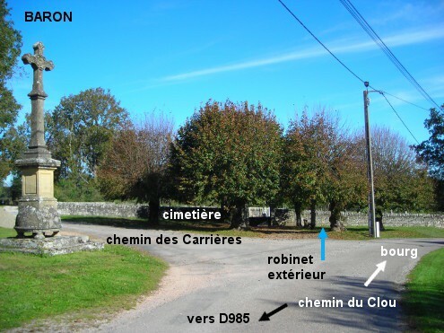 Le cimetière est situé au-dessus du bourg. Sur la D985 en direction de Charolles, tourner à gauche en direction de Baron, puis à droite (la route tout droit retombe sur la D985), environ 810 mètres après la D985, en face d'une grande croix côté gauche, dans la fourche entre le chemin des Carrières et le chemin du Clou, on verra le cimetière desservi par une allée bordée d'arbres de part et d'autre. Le robinet est à l'extérieur à droite du portail dont il est éloigné de quelques mètres. N.B. : A partir du bourg, sur la D327 en provenance de Martigny-le-Comte, au niveau du Monument aux Morts et de la Mairie, tourner à droite dans le chemin du Bourg (direction ''le bourg''), suivre la rue et monter vers l'église, continuer à droite de celle-ci dans le chemin du Clou, le cimetière sera au sommet de la côte sur la droite (vu son orientation et la présence d'arbres, il n'est pas bien repérable dans ce sens, se baser alors sur la grande croix précitée).