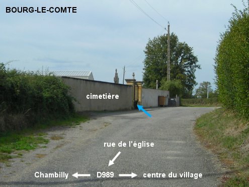 Le cimetière est situé dans une rue secondaire, à 250 mètres de la D989, peu après l'église. 1) En provenance de Chambilly sur la D989, environ 200 mètres après le panneau de début de village, tourner à gauche en épingle dans la rue de l'église (il y a une croix à son début). Après avoir passé l'église érigée côté gauche, on verra le cimetière implanté lui aussi côté gauche. Le robinet est à l'intérieur du cimetière, à gauche du portail. 2) En provenance de Neuilly-en-Donjon et du centre du village, il faut tourner dans la première à droite peu après la grande place où il y a l'obélisque. La croix au début de la rue de l'église est partiellement masquée par des feuillages et se voit moins bien dans ce sens.