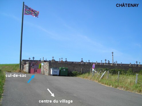 Le cimetière est implanté au-dessus du village, au sommet d'une rue en impasse, à 400 mètres de la D300. A partir de la D300, en provenance de Saint-Racho, peu après l'entrée du village, tourner à gauche en direction du cimetière et en suivant le sens obligatoire vers la droite (rue du musée), continuer dans la rue qui fait une courbe à gauche puis après une portion plane monte ensuite vers la droite (rue de l'église puis rue du cimetière). Le cimetière est au bout de la rue en cul-de-sac. Le robinet est à l'intérieur du cimetière, à gauche du portail.