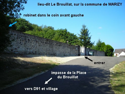 Le cimetière est situé en dehors du village, au lieu-dit Le Brouillat, et à 170 mètres de la D91. Sur la D91 en provenance du village, 530 mètres après le panneau de fin de village, tourner à gauche (embranchement en Y) en direction du cimetière que l'on aperçoit en face. Monter jusqu'au cimetière qui est implanté côté gauche. Entrer et se diriger vers le coin à gauche (allée gravillonnée de 20 mètres) pour trouver le robinet. N.B. : Dans l'autre sens de circulation, on ne voit pas du tout le cimetière depuis la D91. Les bornes kilométriques pourront servir de point de repère : après le point km 9, juste avant le point km 10, tourner à droite en épingle dans l'impasse de la Place du Brouillat pour trouver le cimetière.