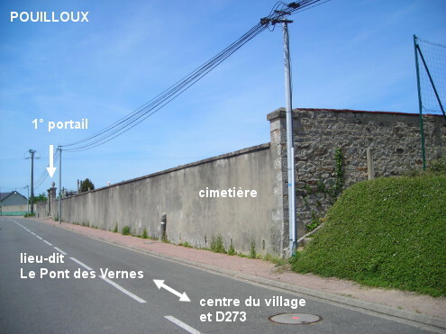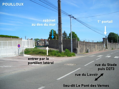 Le cimetière est implanté côté droit sur la route qui mène au lieu-dit Le Pont des Vernes. Sur la D273 en direction de Saint-Vallier et après l'église implantée côté gauche, tourner à gauche dans la rue du Stade en direction du lieu-dit Le Pont des Vernes (il y a aussi une flèche ''cimetière'') et immédiatement après à droite dans la rue du Lavoir. Le plus simple pour accéder au robinet dans le cimetière est d'entrer par le portillon qui est à côté du deuxième portail (celui de gauche, donnant dans la partie la plus récente, en retrait par rapport à l'ancienne pour laisser des places de stationnement au bord de la route). Le robinet est à l'intérieur, à droite du portillon (qui est à 250 mètres de la D273).