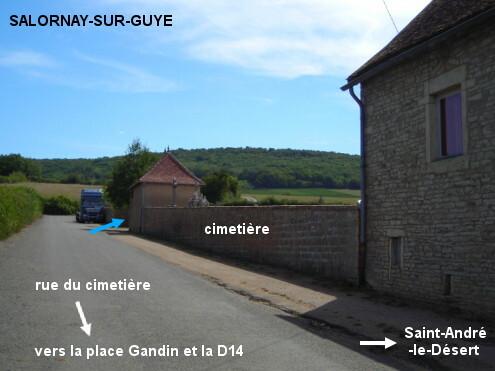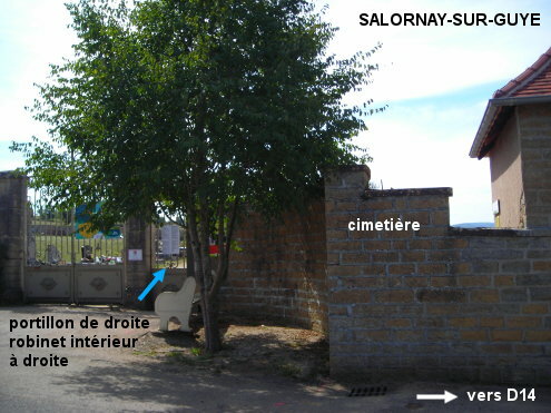 Le cimetière est situé à l'écart de la zone urbaine, dans une rue secondaire, à 590 mètres de la D14. Sur la D14 en direction de Saint-André-le-Désert, à un moment on verra une série de panneaux locaux implantés côté droit, dont celui indiquant le cimetière sur la gauche. Tourner alors à gauche dans la rue qui longe le premier côté de la place Gandin, celle-ci est très longue dans le sens perpendiculaire à la D14. A la fin de la grande place, franchir le pont sur la rivière et continuer tout droit dans la rue du Cimetière. On le trouvera plus loin, implanté côté droit. Entrer par le portillon qui est à droite du portail (ce portillon aux gonds grippés coulisse très mal) pour trouver le robinet à droite de ce portillon-ci.