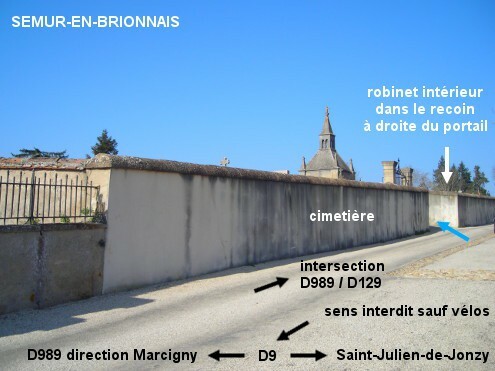 Le cimetière est implanté dans une rue située entre la D9 et la D989, dont une extrémité est face à l'intersection entre la D989 et la D129. En vélo, deux accès sont possibles. 1) Sur la D9 en direction de Saint-Julien-de-Jonzy, juste avant le panneau de fin de village (attention : il est implanté côté gauche et partiellement masqué par un buisson) tourner à gauche dans le chemin des Croix et monter jusqu'au cimetière. Celui-ci est implanté côté gauche 90 mètres plus loin. Le robinet est à l'intérieur du cimetière, dans un recoin entouré de palissades à droite du portail. 2) En provenance de Sarry par la D129, lorsque l'on arrive sur la D989, continuer en face dans le chemin du Cimetière (il est en sens interdit sauf pour les vélos). Le cimetière sera dans ce cas implanté côté droit, 200 mètres plus loin.