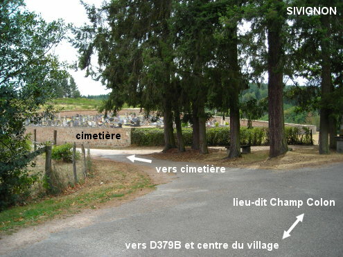 Le cimetière est situé à 230 mètres de la D379B direction Suin. A partir du centre du village, prendre la direction de Suin, et 110 mètres après le carrefour D379 / D379B, à un embranchement en Y où une flèche indique à droite la D379B direction Suin, prendre la banche gauche (direction lieu-dit Champ Colon). Ensuite, prendre à gauche l'allée asphaltée qui dessert le cimetière que l'on aperçoit. Celui-ci est implanté du côté droit de l'allée. Le robinet est à l'intérieur du cimetière, à gauche du portail.