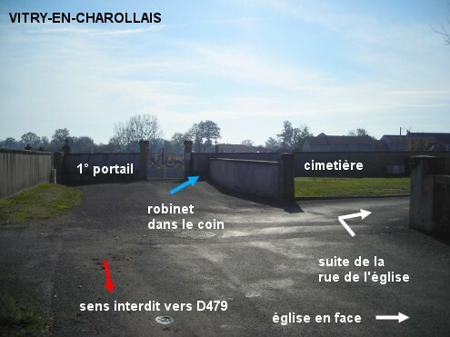 Le cimetière est situé derrière l'église. Sur la D479 en provenance de Paray-le-Monial, tourner à gauche devant l'église, le premier portail du cimetière est au bout du premier tronçon de la rue de l'église qui vire à angle droit derrière l'église et devant le cimetière. Le robinet est à l'extérieur, à droite de ce premier portail, dans le coin entre le mur du cimetière et la partie de mur qui borde la branche en cul-de-sac de la rue. N.B. : Pour repartir, étant donné que le premier tronçon de la rue est en sens unique, tourner à droite dans le passage goudronné entre les murets, suivre la rue qui tourne à gauche le long du côté du cimetière (ne pas aller à droite à côté de l'église : c'est gravillonné et ensuite il faudrait descendre des escaliers jusqu'à la D479), puis à droite pour déboucher plus loin à un carrefour en T sur la voie C2 (rue de la Mairie). Si on prend celle-ci à droite on retourne aussitôt sur la D479, sinon sur la gauche on part en direction du lieu-dit La Moirette.