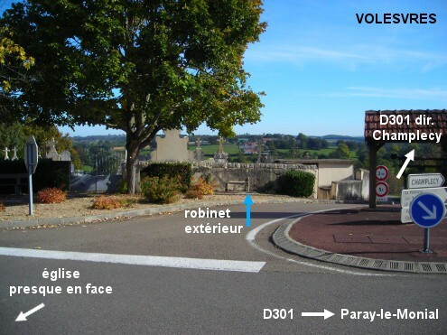 Le cimetière est situé à proximité de l'église, au niveau de l'angle droit que fait la D301 dans le village. En provenance de Paray-le-Monial, peu avant l'église côté gauche dans la rue qui est en face, la D301 se poursuit à angle droit sur la droite en direction de Champlecy. Lorsque l'on regarde dans cette direction, le cimetière est implanté côté gauche et son premier portail est en face. Le robinet est à l'extérieur, à droite dudit portail dont il est un peu éloigné. N.B. : Devant le cimetière à droite, des escaliers descendent vers d'anciennes toilettes sans robinet (et en partie désaffectées).