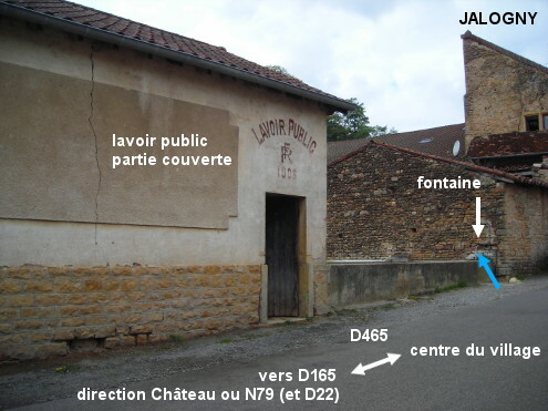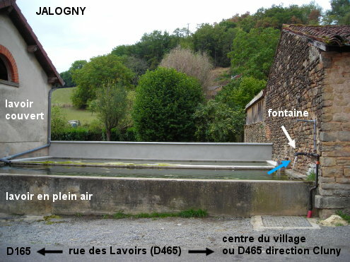 Le lavoir est situé à proximité de l'angle que fait la D465 en bordure du bourg. 1) En provenance du sud sur la D465 (en venant par exemple de Bourgvilain par la D22), on verra le lavoir sur la gauche avant le carrefour où la D465 oblique à droite en direction de Cluny. Ce lavoir public est composé d'une partie couverte à gauche et d'un immense bassin en plein air à droite dans lequel s'écoule une fontaine fixée sur le mur du bâtiment mitoyen à droite. AVERTISSEMENT : Cette fontaine n'est accompagnée d'aucun écriteau se rapportant à la potabilité de l'eau, mais on peut supposer que si elle était impropre à la consommation il y aurait un panneau d'interdiction. 2) En provenance de Cluny sur la D465 ou à partir du centre du village, il faut suivre le panneau ''vers N79''. Dans ce cas, le lavoir sera situé sur la droite 20 mètres après le carrefour.