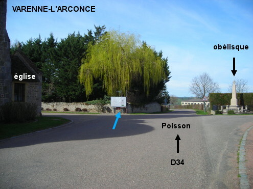 Le robinet se trouve sous un panneau d'informations touristiques situé entre l'église et l'obélisque du Monument aux Morts, à l'angle de la D34 et de la rue conduisant à la Mairie. Sur la D34 en direction de Poisson, on verra d'abord l'église côté gauche entre deux rues, puis côté droit l'obélisque dans la fourche du carrefour de la D34 avec une petite route à droite. Le grand panneau sous lequel se trouve le robinet fixé au muret, est situé côté droit au début de la rue qui est juste après l'église (c'est son arrière que l'on voit côté D34).