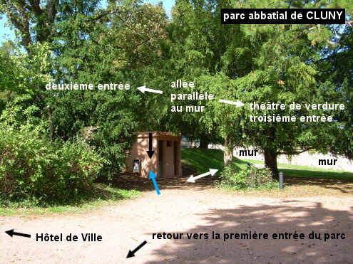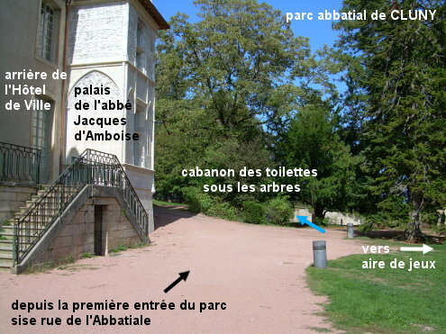 Ces toilettes se trouvent dans le ''parc abbatial'' situé derrière l'Hôtel de Ville (fléché) et dans lequel il y a le ''théâtre de verdure'' à proximité de la ''tour Fabry'' (à toit très pointu). Le petit bâtiment des toilettes sous les arbres ne se voit pas depuis les entrées du parc. Prendre la première entrée à droite de l'Hôtel de Ville puis longer son arrière sur l'allée en terre battue jusque sous les arbres pour découvrir le cabanon des toilettes côté gauche. Le robinet est sur le côté gauche dudit cabanon (à 70 mètres de l'entrée du parc). N.B.: Le parc est ouvert de 6h à 23h d'avril à septembre et de 6h à 22h d'octobre à mars. Sur la D15 en provenance de Donzy-le-Pertuis, franchir le petit pont sur la rivière et traverser la D980 pour prendre en face la rue en sens unique qui rentre dans la zone 20 (priorité aux piétons) et traverse le centre-ville d'est en ouest. Dans cette suite de rues quand on voit le ''syndicat d'initiative'' sis côté droit, continuer encore un peu jusqu'au carrefour suivant et tourner à droite (rue de la République) en direction de l'Hôtel de Ville, puis tourner dans la deuxième à droite (rue de l'Abbatiale). Passer sous les ''portes d'honneur'' (deux grandes arches vestiges de l'ancienne enceinte de la cité-abbaye) pour arriver devant la première entrée du parc 90 mètres après le début de la rue. P.S. : Pour repartir, retourner rue de la République et continuer dans sa suite (à droite), puis prendre la branche droite du Y (vers le ''puits des pénitents'') pour arriver plus loin au carrefour (à côté d'un lavoir) avec le chemin des Trépassés (cimetière à gauche puis D152 direction Château, ou tour Fabry à droite puis ''toutes directions'' vers la D980). N.B. : La troisième entrée du parc accessible en montant un long escalier situé rue Porte des Prés n'est pas pratique pour un cycliste.