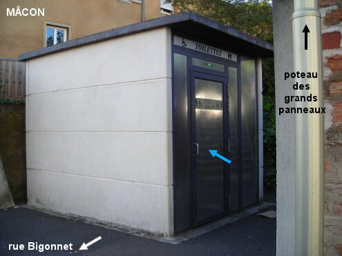 Ces toilettes se trouvent à proximité du rond-point proche de l'église Saint-Clément, et non loin de la gare SNCF. Au sortir de l'avenue de la Gare, prendre à droite la piste cyclable longeant le côté droit de la rue Bigonnet et bordée par un haut mur côté gare, jusqu'à un ensemble de grands panneaux de signalisation peu avant le rond-point. C'est au niveau de ce panneau, à la fin du haut mur et avant plusieurs bâtiments, qu'est situé l'accès aux toilettes (fléchées). Il s'agit d'une cabine WC à nettoyage automatique et dotée d'un lavabo dans lequel l'écoulement de l'eau est commandé par une cellule à détection (le jet est puissant). P.S. : Si on continue jusqu'au rond-point on aura accès à la D17 direction Cluny.