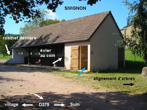 Les toilettes sont situées dans un bâtiment de la salle des fêtes (suivre le fléchage) juste après la sortie du village sur la D379 en direction de Suin. Environ 90 mètres après le panneau marquant la fin du village, la route fait une courbe à droite mais continuer en face dans l'allée en terre battue de 50 mètres qui dessert la salle des fêtes (celle-ci ne se voit pas bien depuis la route car masquée par un alignement d'arbres). Dans l'autre sens de circulation (c'est en descente), il faut tourner à droite après le panneau signalant une intersection prioritaire en suivant la flèche ''salle des fêtes'' (susceptible d'être masquée par des conteneurs poubelle posés devant!). Les toilettes sont au début du long bâtiment qui est implanté à droite de l'allée. N.B. : Dans la partie principale ouverte du bâtiment (qui n'a que trois murs), il y a un évier avec deux robinets dans le coin droit. Il y a aussi un robinet extérieur sur le mur gauche côté opposé à la route.