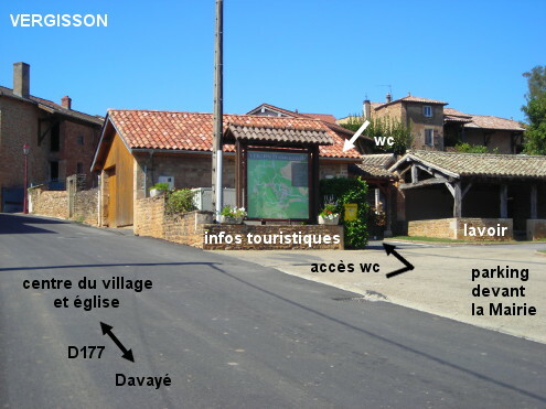 Les toilettes se trouvent au bord du parking situé devant la Mairie et implanté au bord de la D177. En provenance de Davayé sur la D177, peu après le début du village, on verra sur la droite le grand parking situé devant la Mairie très en retrait. Entrer à droite sur la partie gauche du parking à côté du panneau d'informations touristiques et de la boite-aux-lettres jaune de La Poste incluse dans une haie. Se diriger vers la gauche pour trouver le bâtiment des toilettes dans le coin, à côté d'un abri et d'un ancien lavoir sur sa droite.
