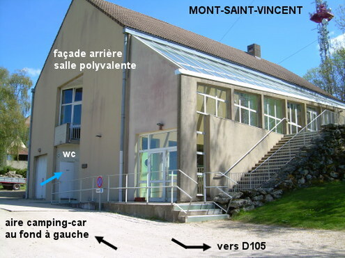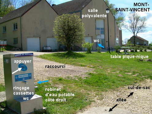 L'aire pour camping-car (fléchée) est située derrière la salle polyvalente sise à l'entrée du village sur la D105. Les toilettes sont dans le même bâtiment que la salle polyvalente, sur sa façade arrière, en face d'une aire de jeux. La borne pour camping-car avec robinets est implantée au bout de l'allée qui passe derrière la salle polyvalente. En provenance de Mary sur la D105, juste après le panneau de début de village (dans lequel la circulation automobile est interdite sauf aux riverains), tourner à gauche en suivant les flèches du parking obligatoire pour les visiteurs et de l'aire pour camping-car. Puis, en suivant la flèche de l'aire pour camping-car, tourner aussitôt à droite dans l'allée gravillonnée qui passe derrière la salle polyvalente, entre celle-ci et un site composé d'une aire de pique-nique, d'une aire de jeux et d'un terrain de basket situés côté gauche. 1a) La porte des toilettes sur la façade arrière de la salle polyvalente est identifiée par un petit écriteau avec le pictogramme ad-hoc (à 50 mètres de la D105, dont 25 mètres gravillonnés). N.B.1 : Il y a un lavabo et un grand évier dans lequel on peut facilement remplir des bidons de grande taille. 1b) L'aire pour camping-car est sur la gauche au bout de l'allée gravillonnée qui se termine en arc de cercle sur la gauche. N.B.2 : Pour faire couler l'eau, il faut d'abord appuyer sur le bouton situé sur la face avant de la borne (orientée côté opposé à la salle polyvalente) et ensuite tourner le robinet qui est sur le côté droit de la borne, qui est celui accompagné d'un pictogramme eau potable.